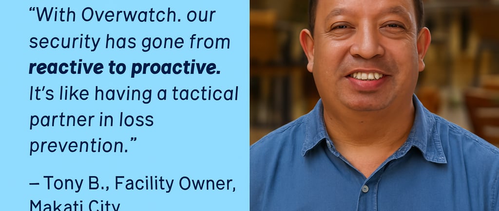 “With Overwatch, our security has gone from reactive to proactive. It’s like having a tactical partner in loss prevention.” — Tony B., Facility Owner, Makati City